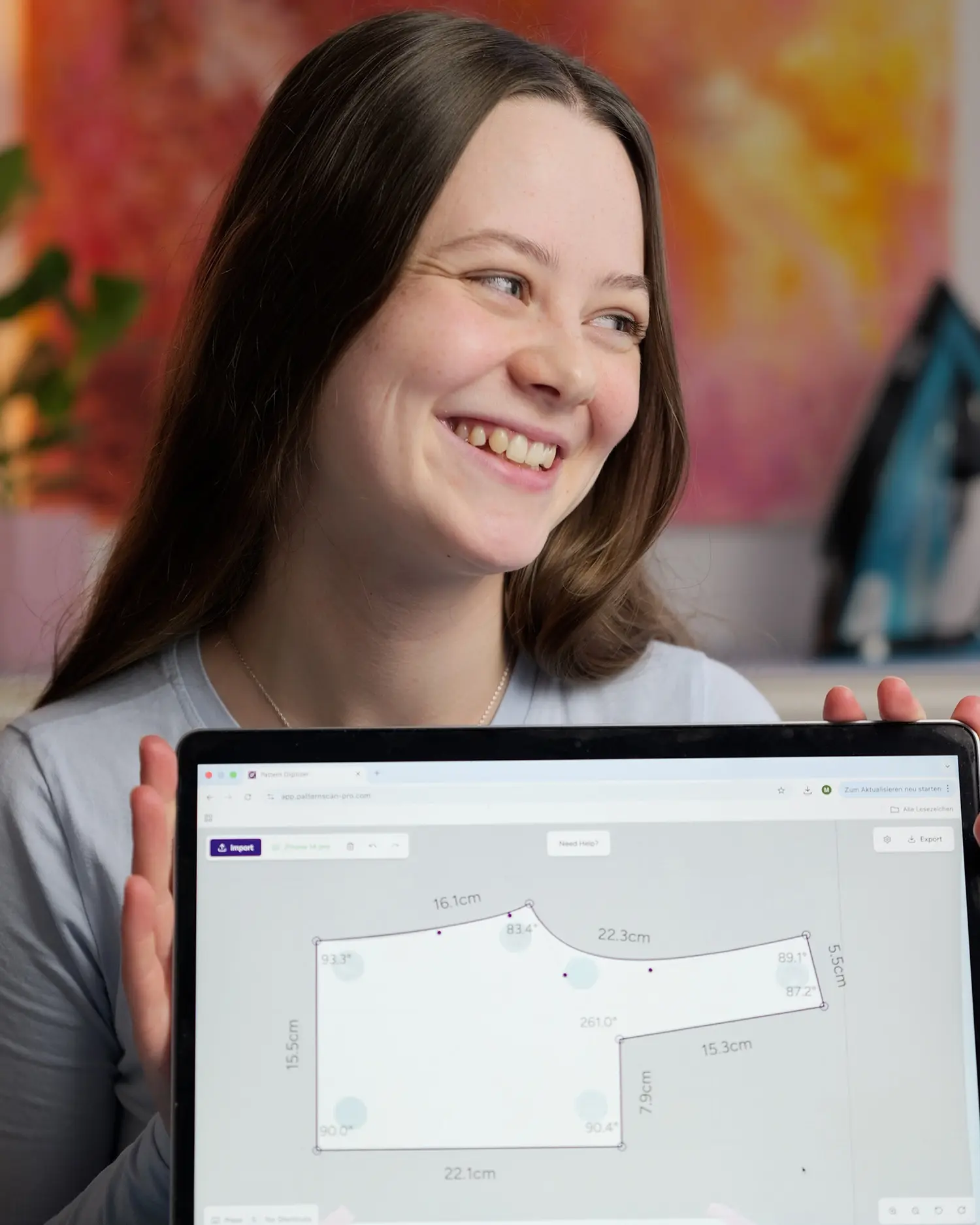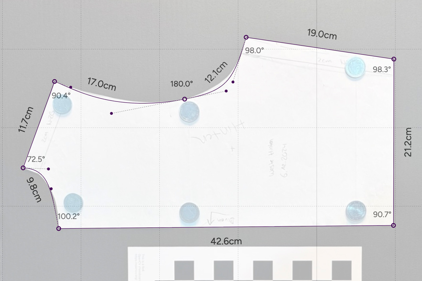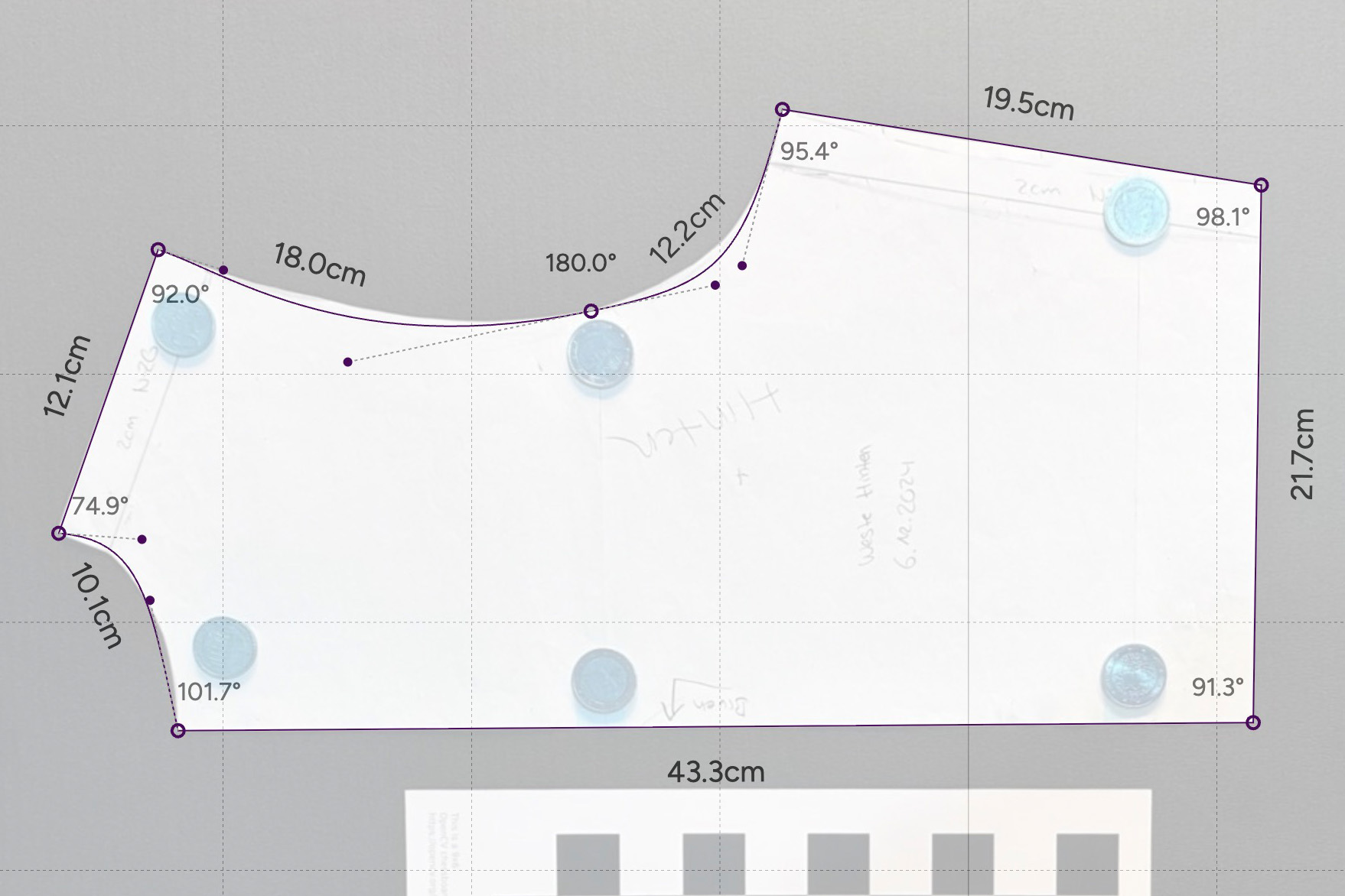 No manual tracing needed. PatternScan Pro detects pattern contours automatically. Adjust individual control points if needed. All lengths and angles display in real time.