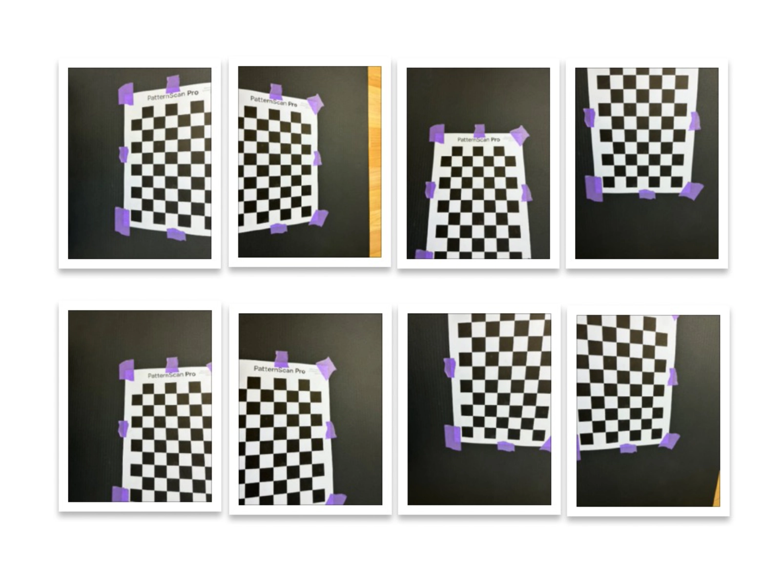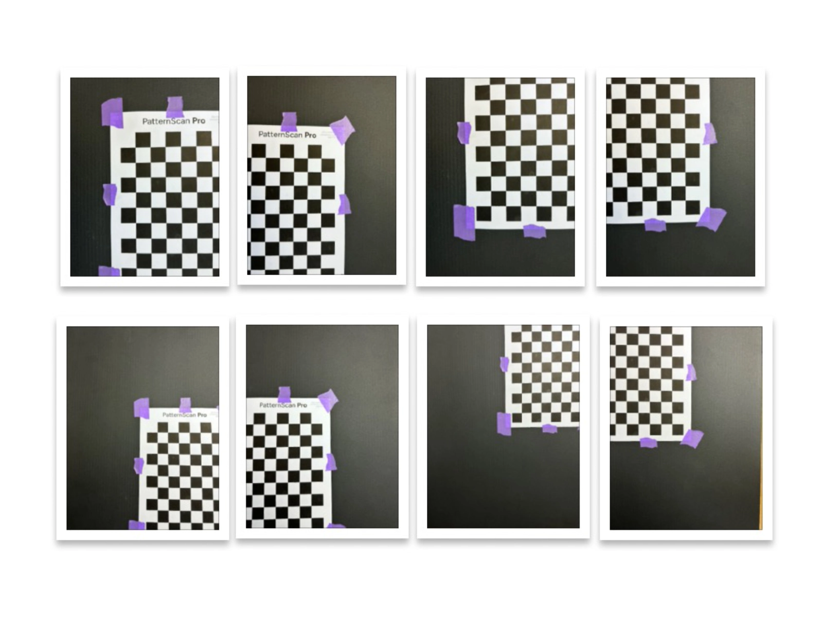 Photograph at slight angles from the corners. The outer row of the checkerboard should be cut off as well – the edges are most important for calibration. Perspectives capture maximum distortion and complete your camera's distortion profile. You need 4 images from this perspective.