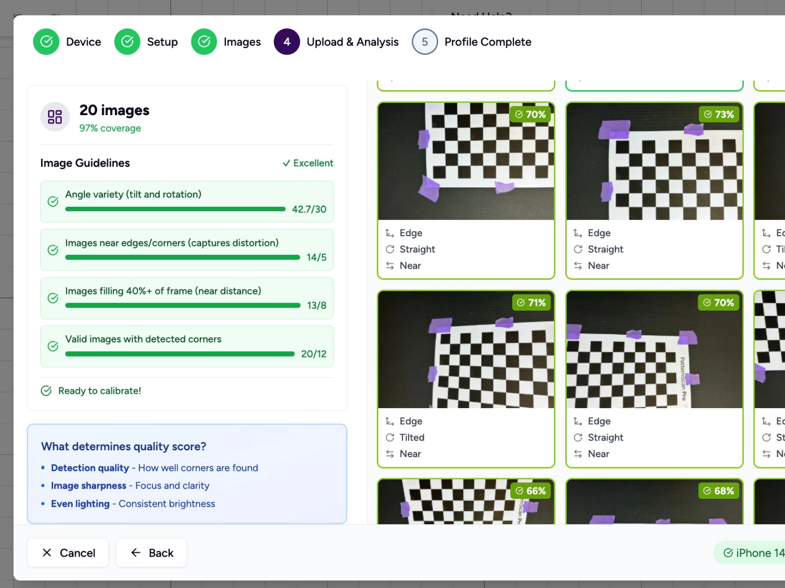 The wizard shows you which perspectives you've covered and which are still missing. You receive a rating for each individual image and a quality score for your calibration profile. A good calibration scores 90% or higher. If the score is lower, the wizard shows you exactly which images you should add.