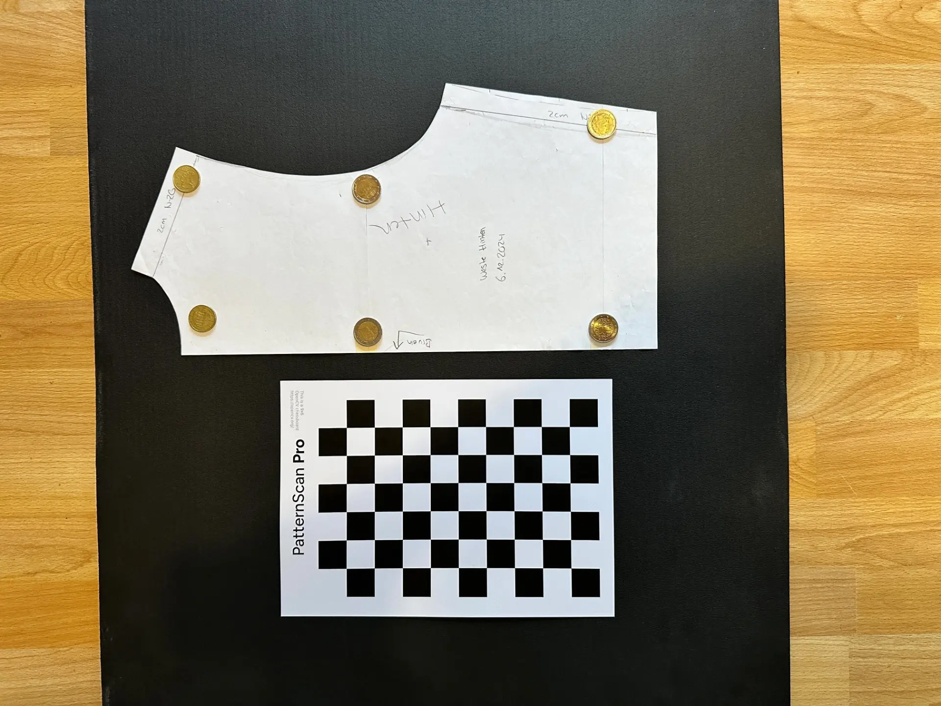 For your next pattern upload, the calibration profile should be active (the name of the profile green in the navbar). Place the checkerboard reference next to your sewing pattern and photograph with the same camera. PatternScan Pro automatically detects the reference and applies your profile.